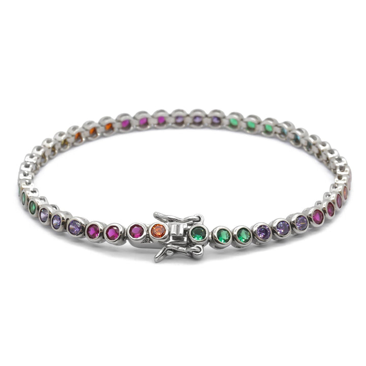 Esta pulsera tennis con circonitas multicolor es perfecta para quienes aman los detalles vivos y desean un accesorio versátil que exprese personalidad. Ideal tanto para el día a día como para añadir un toque de color a looks elegantes.