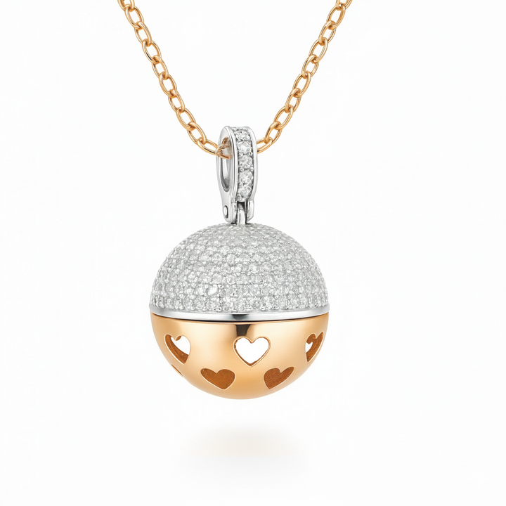 Un gioiello speciale e delicato, perfetto per accompagnare ogni futura mamma nei momenti più dolci della gravidanza. Il pendente traforato, decorato con cuori e impreziosito da zirconi luminosi, custodisce al suo interno un piccolo sonaglio che emette un dolce suono, creando un legame unico e profondo tra mamma e bambino.
